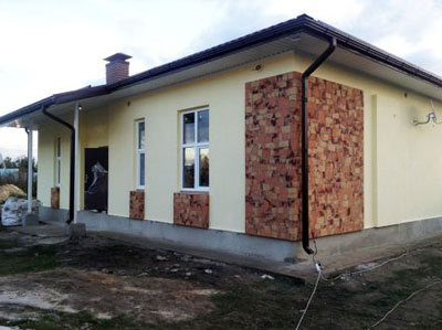 Рваный камень Delap Ciprus Korall 900V в оформлении фасада дома ярких апельсиновых оттенков с неровными краями предназначен для отделки фасадов и внутренних интерьеров. Его основу составляет натуральная мраморная крошка. Укладывается на бетон, кирпич, дерево, гипсокартон, штукатурку, утеплители и другие поверхности.