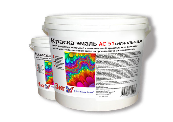 Сигнальная флуоресцентная краска АС-51 отличается повышенной яркостью по сравнению со стандартными масляными, водно-дисперсионными и акриловыми красками. При ультрафиолетовом освещении придает окрашенным поверхностям «кислотные» цвета и насыщенное флуоресцентное свечение благодаря входящим в ее состав пигментам.