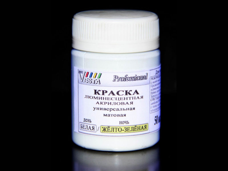 Способна светиться в полной темноте до 12 часов без подзарядки. На свету поверхность, покрашенная универсальной краской, будет матовой белой, в темноте – "светящейся" желто-зеленой. После резкого перехода из света в темноту наблюдается яркое и видимое свечение окрашенной поверхности в течение 1-2 часов, затем оно плавно ослабевает.