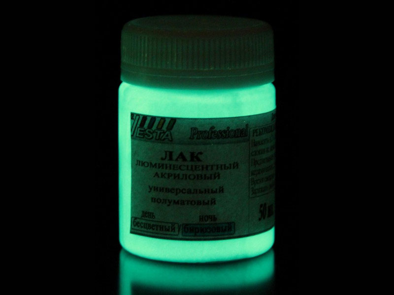 При освещении лак бесцветен, в темноте имеет бирюзовое свечение.