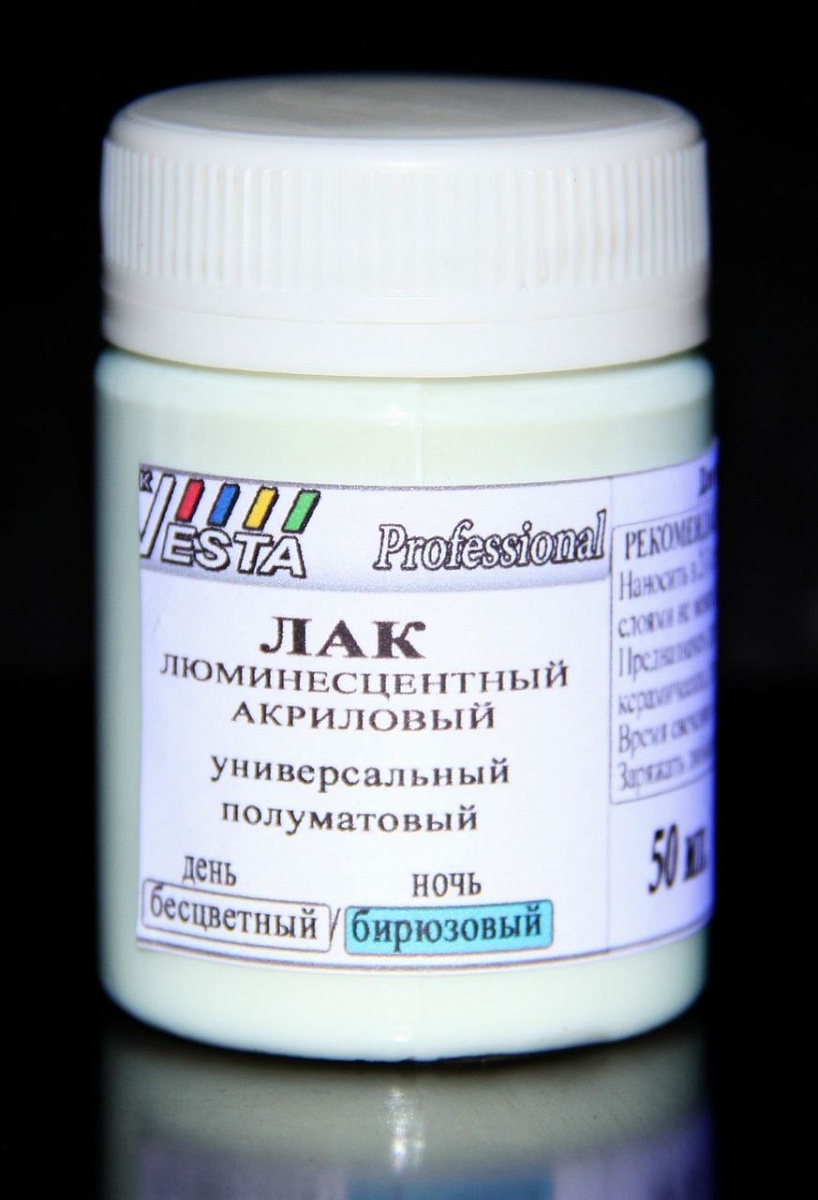Лак люминесцентный бесцветный / бирюзовый на основе акрила обладает более стойким свечением в отличие от других люминесцентных красок, поскольку в его составе нет дополнительных компонентов и цветных пигментов.