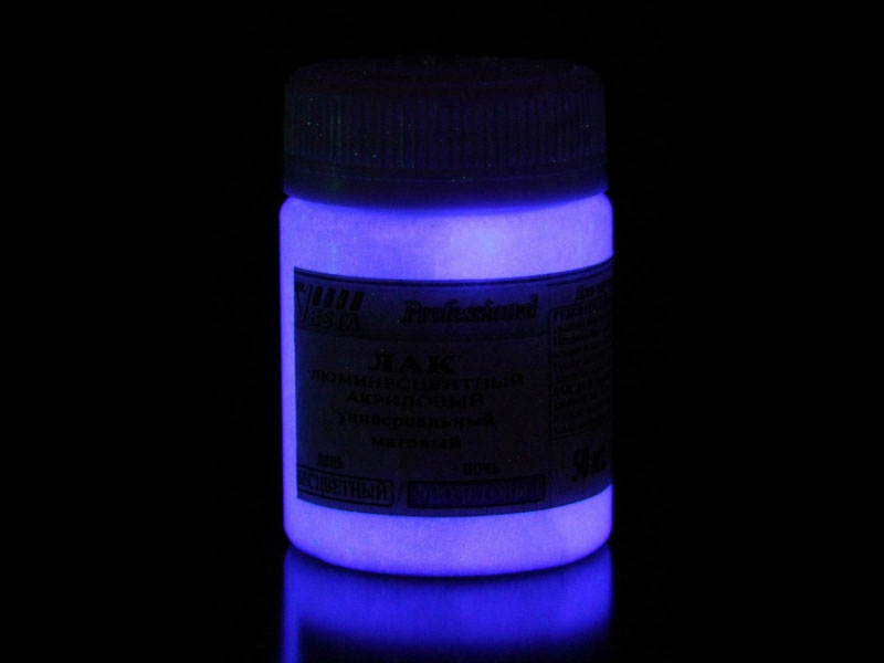 Лак люминесцентный бесцветный / фиолетовый на основе акрила обладает более стойким свечением в отличие от других люминесцентных красок, поскольку в его составе нет дополнительных компонентов и цветных пигментов.