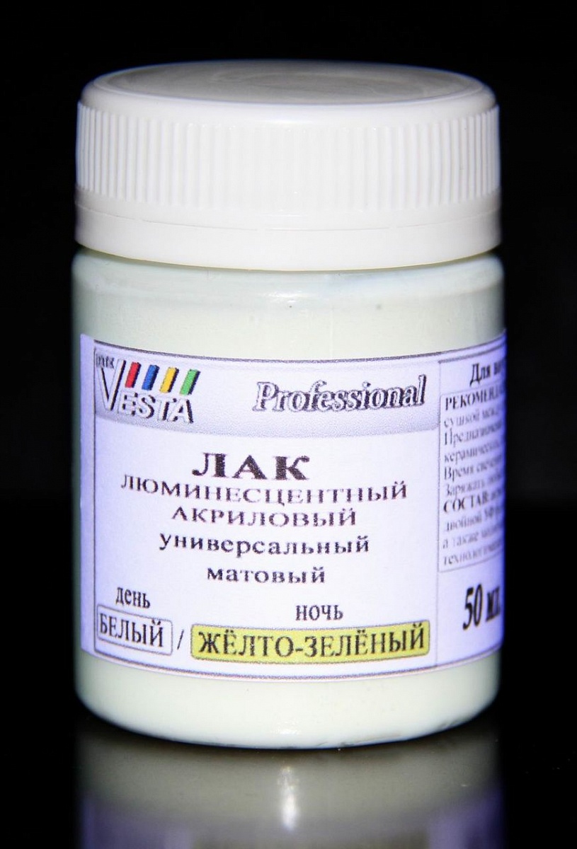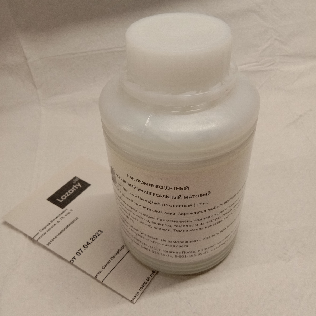 При освещении лак бесцветный, в темноте светится желто-зеленым цветом.