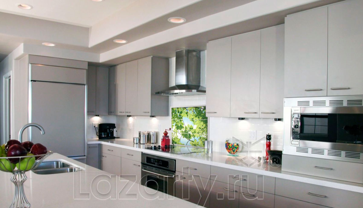 - Фартук для кухни из стекла легко моется. Он прост в установке, которую можно произвести самостоятельно.