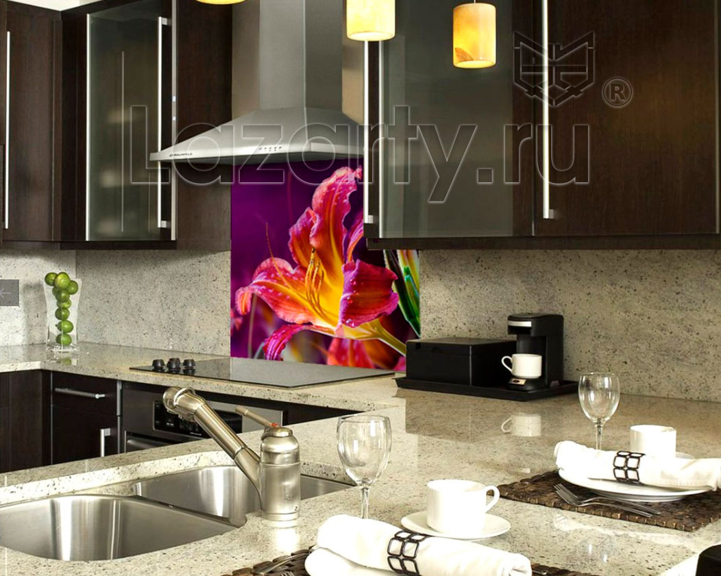Оплата картой онлайн переводЗащитное стекло Огненная лилия с изображением яркого цветка на тёмном фоне надёжно оберегает стены кухни от перегрева, избыточной влажности, брызг масла и пищи. Рисунок на фартук нанесен методом УФ-ФОТОПЕЧАТИ, поэтому имеет чёткое изображение без полос.