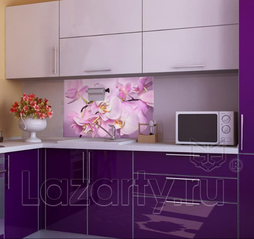 Оплата картой онлайн переводЗащитное стекло для кухни Орхидеи выполнено при помощи метода цифровой УФ печати. Изображение прекрасных экзотических цветов на розовом фоне выглядит нежно и красочно в интерьере.