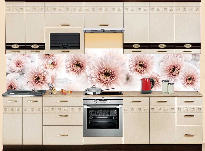 Композиция из нежно-розовых цветов фартука МДФ AF 33 станет главным декоративным элементом кухни или гостиной. Соединив светлую мебель или стены вместе с МДФ панелью, получим нежный классический интерьер, темные поверхности добавят контраста.