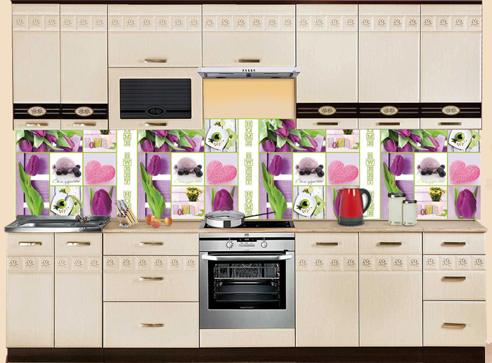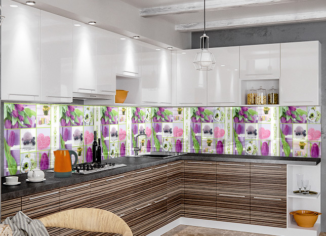 Романтичный коллаж из сиреневых тюльпанов фартука МДФ F 08 станет самой яркой деталью кухни или гостиной. Нежные аксессуары в розовых оттенках дополняют цветочную композицию. Однотонная мебель и стены помогут сделать главный акцент на МДФ панели, которая не только декорирует, но прекрасно защищает поверхности от брызг и загрязнений.