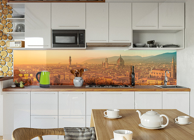 Оплата картой онлайн переводЭффектный фартук МДФ Городской пейзаж 3 с изображением панорамы просыпающейся Флоренции выполнен по технологии Альбико.
