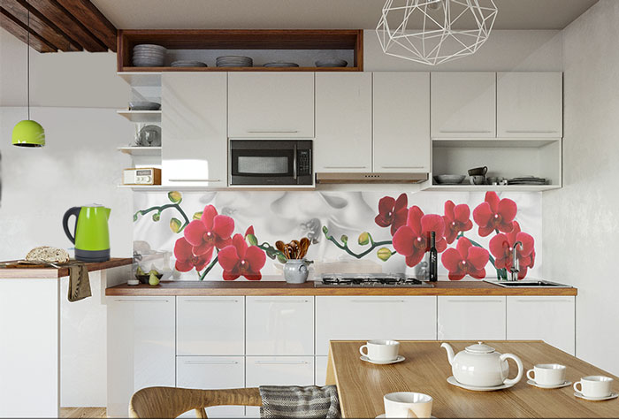 Существует огромное количество вариантов дизайна фартуков на различные темы: пейзажи, натюрморты из цветов, фотографии городов, кофейная тематика, фрукты, овощи, композиции, имитация камня, дерева и других поверхностей. Выбрать действительно непросто, потому что все они безумно красочные. Монтаж панели производится после выполнения всех отделочных работ на территории кухни. Более подробно о способах установки и разрешенных клеевых составах читайте здесь.