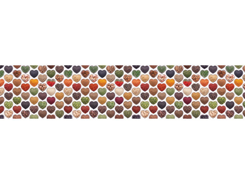Яркий красочный фартук МДФ Сердечки обязательно должен поселиться на вашей кухне. Ароматные специи и восточные пряности всех цветов собраны в фигурные модули в виде сердечек. Данная композиция будет возбуждать аппетит и стимулировать хозяев готовить яркие, экзотические блюда.