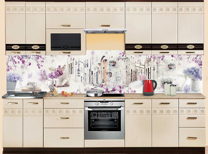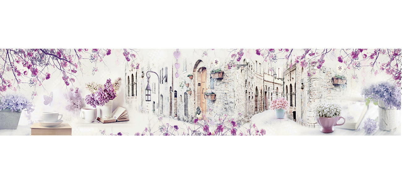 Фартук МДФ Серия Лайт S8 с изображением старинных городских улочек в период цветения – шикарная декоративная панель для украшения и защиты стен кухни. Акварельный рисунок весеннего города создает дополнительную перспективу, что зрительно расширяет пространство помещения.