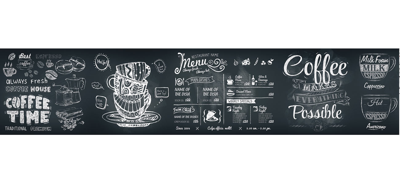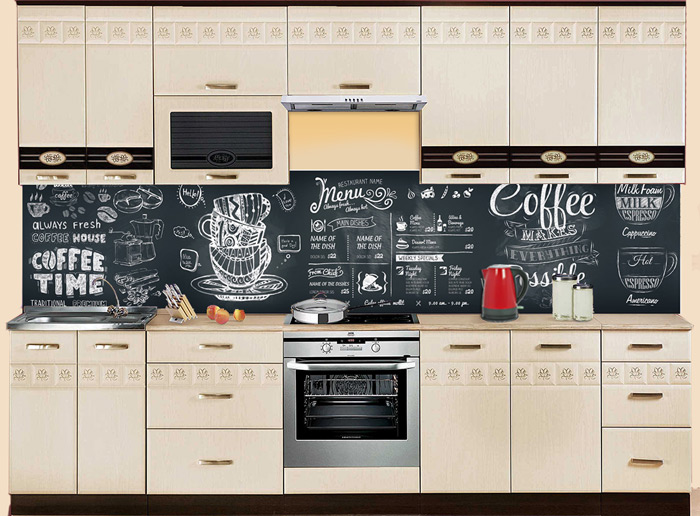 Фартук МДФ Серии Лайт S10, имитирующий графитовую доску с меню кафе, - оригинальный способ защитить поверхности стен и украсить интерьер. Черно-белая графика панели предполагает применение аналогичной гаммы или наоборот ярких цветов мебели, стен. Стильная панель может служить также отличной вывеской для кофейни или летнего кафе.