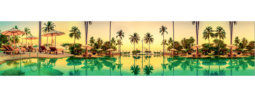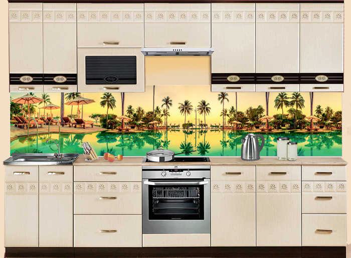 Фартук МДФ Пальмовая сказка с чудесным видом на бассейн в часы рассвета - великолепный декоративный элемент для стен кухни или гостиной. Изображения пальм и водной бирюзовой глади возвращает нас в лето и создает отпускное настроение. Эффектная композиция МДФ-панели SP 126 несомненно украсит и надежно защитит поверхности от брызг и загрязнений благодаря наличию глянцевого слоя.