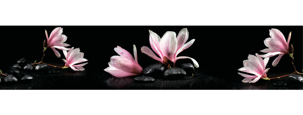 Стильный черный фартук МДФ Магнолия на камнях с розовыми цветами великолепно смотрится в интерьере кухни, гостиницы или кафе. Контрастные цвета и реалистичный рисунок мдф-панели SP 130 делает яркий акцент на стенах. Глянцевый красочный слой надежно защищает поверхности стен от брызг и загрязнений.