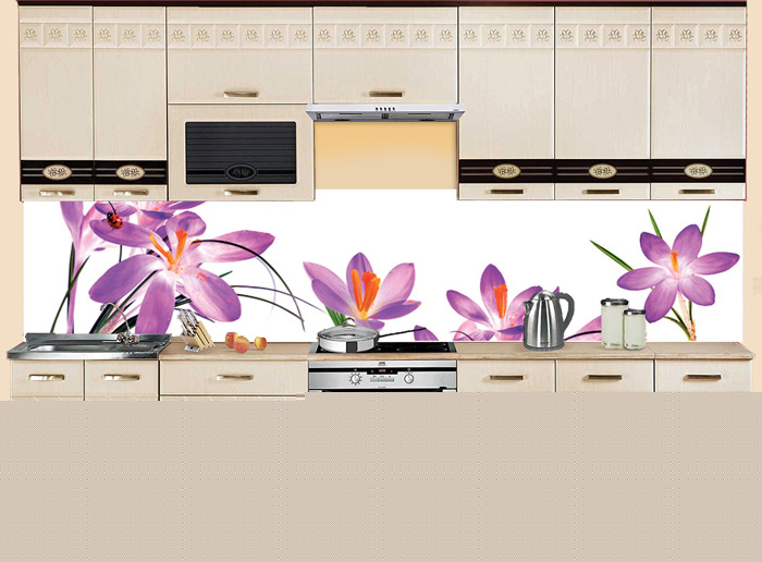 Симпатичный фартук МДФ Нежные крокусы с сиреневыми распустившимися цветами - прекрасная декорация и защита для стен. Нежные цветки на белом фоне - отличное сочетание, добавляющее яркости в интерьер комнаты. Стеновая панель SP 134 может стать не только украшением кухни, но также холлов гостиниц, зала кофейни или ресторана, салонов красоты. Глянцевый красочный слой надежно защищает поверхности стен от брызг, влаги и загрязнений.