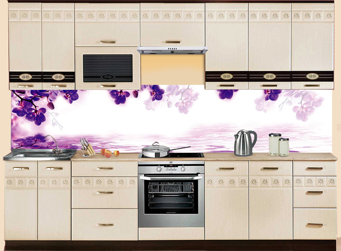 Фартук МДФ Экзотика с живописным акварельным пейзажем в аметистовой необыкновенно красочно выглядит на стенах любого интерьера. Нежный рисунок цветущего дерева у воды в туманной дымке создает иллюзию перехода столешницы в сиреневую водную гладь. Прозрачный глянцевый слой стеновой МДФ-панели SP 151 имитирует стеклянную поверхность и надежно защищает стены от брызг, влаги и загрязнений.
