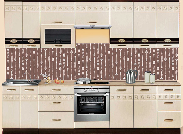 Фартук МДФ SP 175 с изображением столовых приборов на фоне шоколадного цвета - оригинальное украшение рабочих стен кухни или кафе. Надежный глянцевый слой МДФ панели имитирует стеклянную поверхность и превосходно защищает уязвимую зону от влаги и загрязнений.
