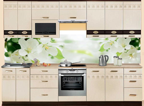Светлый фартук МДФ SP 199 с яблоневыми цветами - эффектное покрытие стен кухни или гостиной. Яркие краски, реалистичный рисунок цветущих веток невероятно украшает пространство комнаты и освежает интерьер, создавая солнечное настроение. Высокий глянцевый слой МДФ-фартука имитирует стеклянную поверхность и превосходно оберегает стены от влаги, загрязнений и выгорания на солнце.