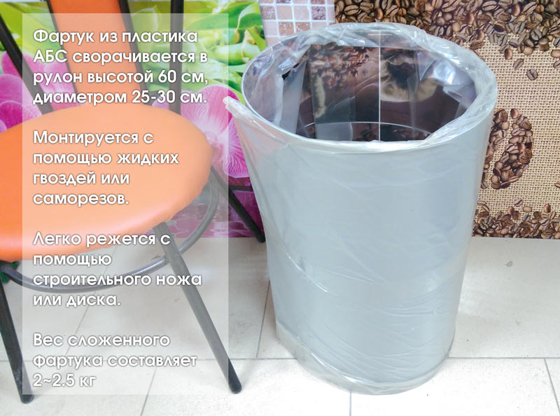 Фартук из пластика АБС сворачивается в рулон высотой 60 см, диаметром 25-30 см.