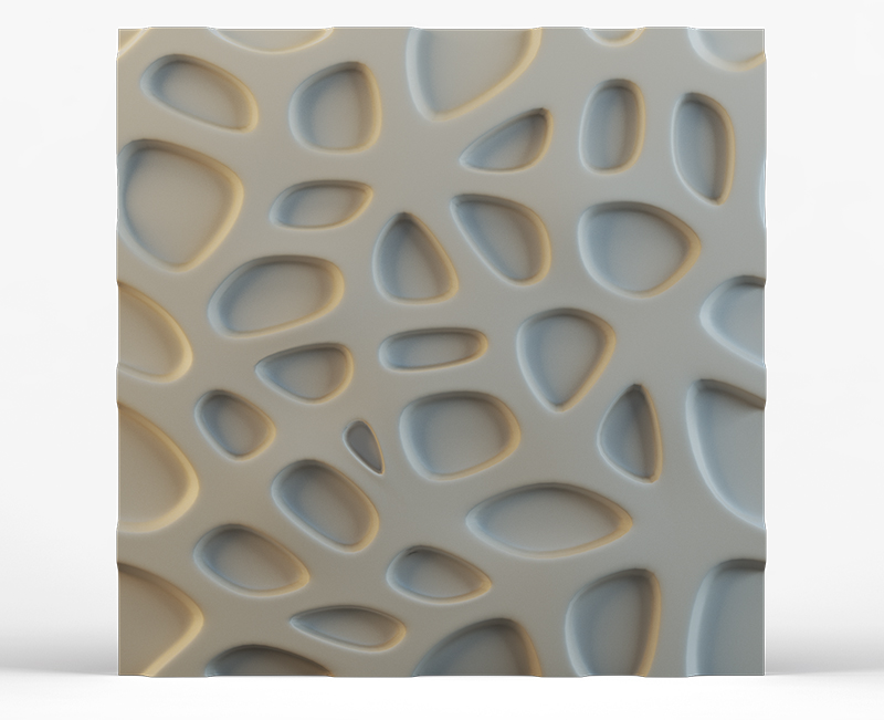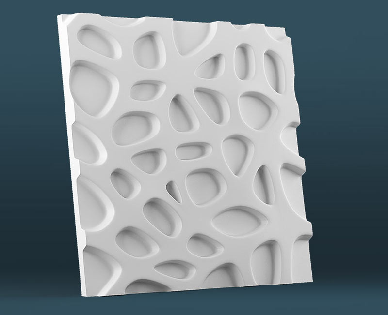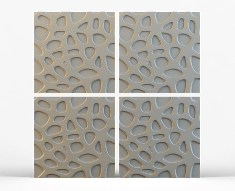 Гипсовые 3D панели Кратер созданы в виде плитки размером 50х50 см. Их легко и просто укладывать. Просчитать площадь поверхности стен и требуемое количество плиток не составит труда. Общая площадь четырех модулей составляет ровно 1 кв. м.