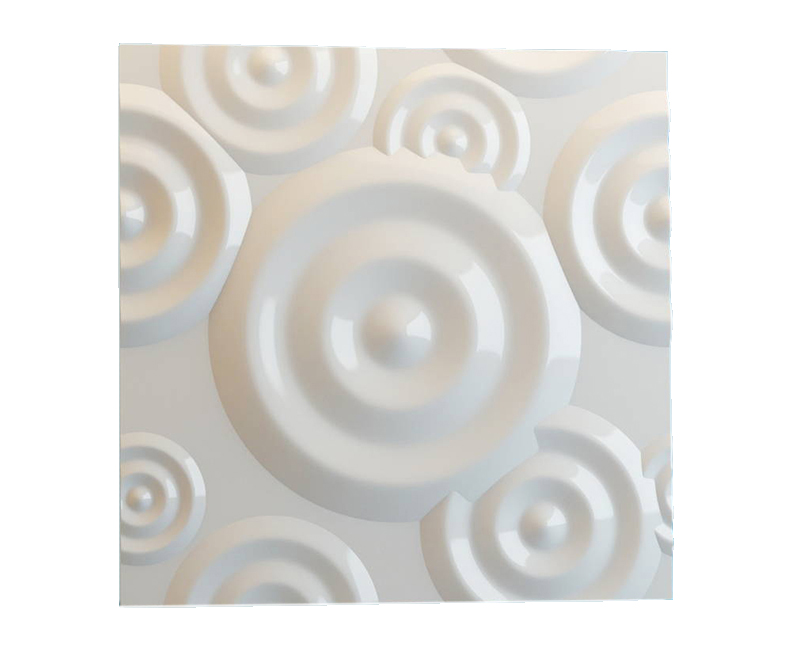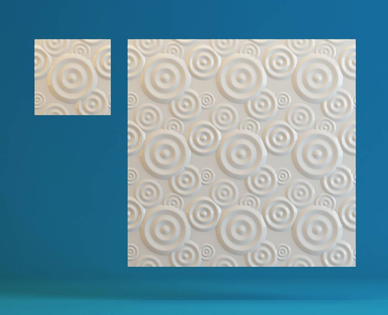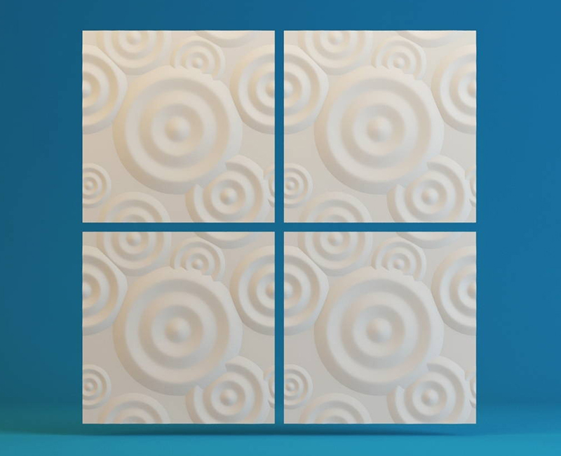Гипсовые 3D панели Круги созданы в виде плитки размером 50х50 см. Их легко и просто укладывать. Просчитать площадь поверхности стен и требуемое количество плиток не составит труда. Общая площадь четырех модулей составляет ровно 1 кв. м.