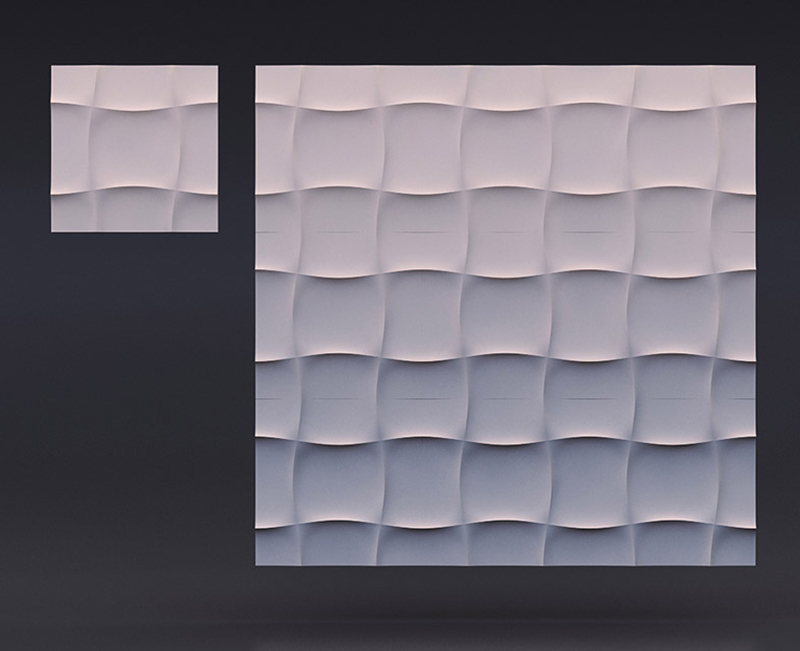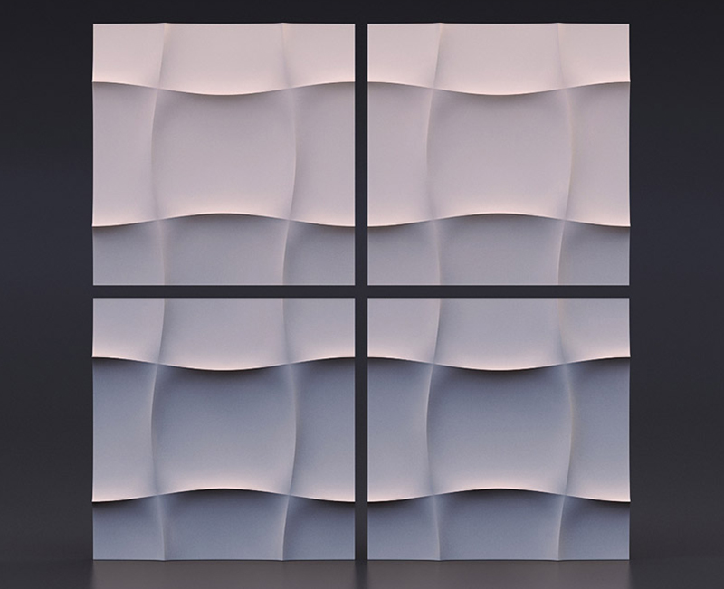 Гипсовые 3D панели Мягкий квадрат созданы в виде плитки размером 50х50 см. Их легко и просто укладывать. Просчитать площадь поверхности стен и требуемое количество плиток не составит труда. Общая площадь четырех панелей составляет ровно 1 кв. м.