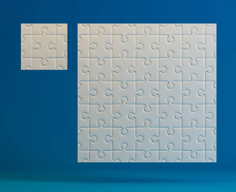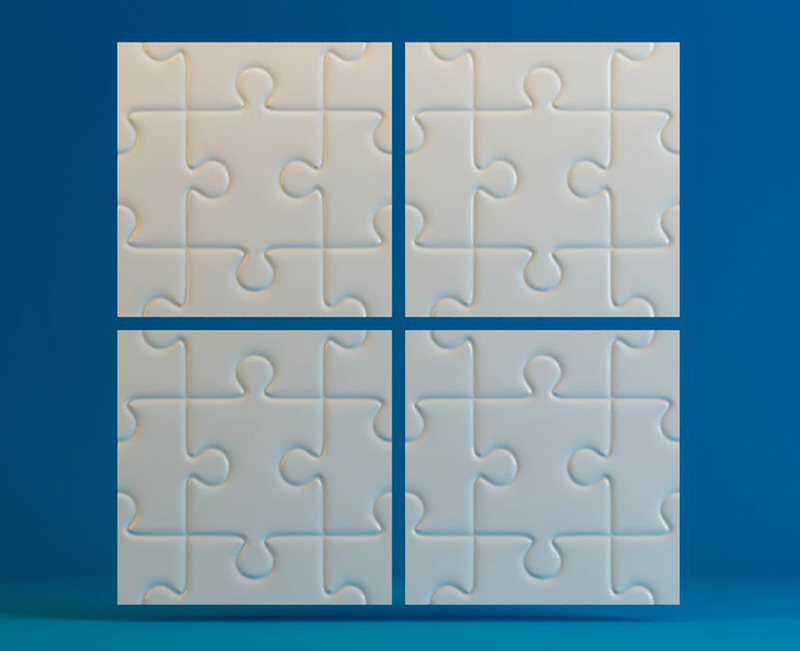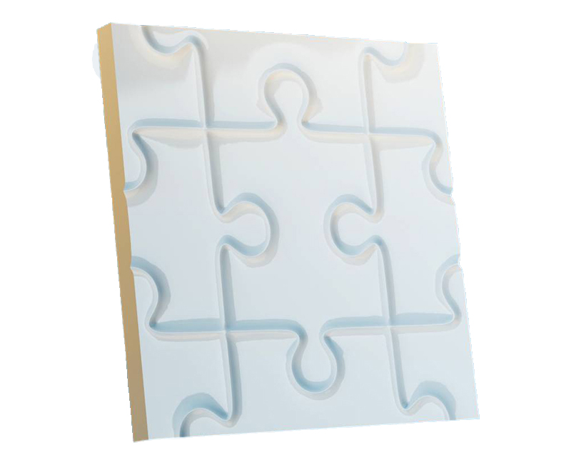 Гипсовые 3D панели Пазл большой с абстрактным геометрическим рисунком созданы в виде плитки размером 50х50 см. Их легко и просто укладывать. Просчитать площадь поверхности стен и требуемое количество плиток не составит труда. Общая площадь четырех модулей составляет ровно 1 кв. м.