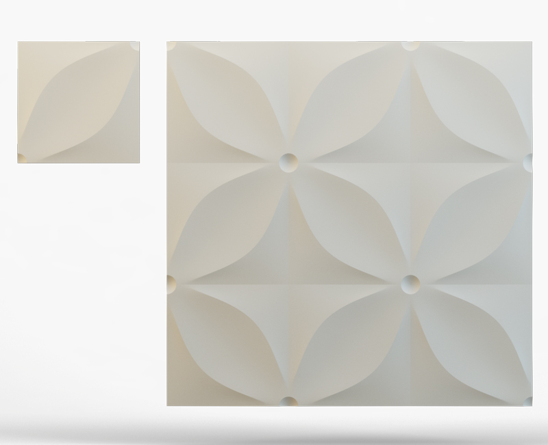 Гипсовые 3D панели Звезда созданы в виде плитки размером 50х50 см. Их легко и просто укладывать. Просчитать площадь поверхности стен и требуемое количество плиток не составит труда. Общая площадь четырех модулей составляет ровно 1 кв. м.