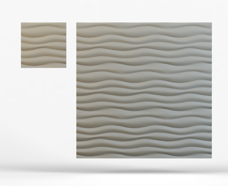 Декоративные стеновые панели 3d с волнами произведены в виде квадратной плитки размером 500x500 мм с объемным волнистым рельефом.