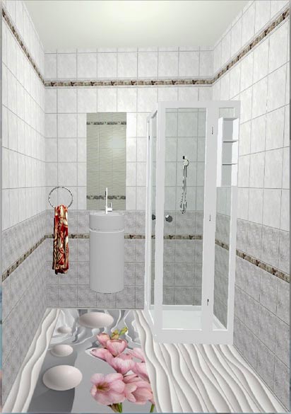 Влагостойкий 3D пол Абстракция с необычными, абстрактными картинками - оригинальная и недорогая отделка для ванной и санузла. Светло-серая цветовая гамма в комбинации с розовым плюс различные геометрические рисунки - эффектное дизайнерское решение.