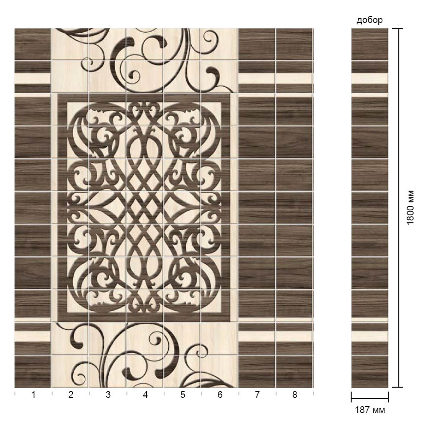 Коллекция для напольной отделки Грация 1 состоит из 8 ламелей. Если комплект покрывает не всю площадь помещения, то можно купить отдельно доборы с аналогичным дизайном размером 1800*187 см. Занимаемая площадь: 2,7 м2.