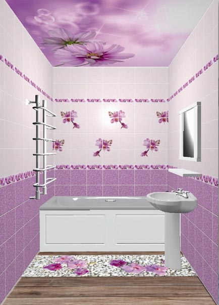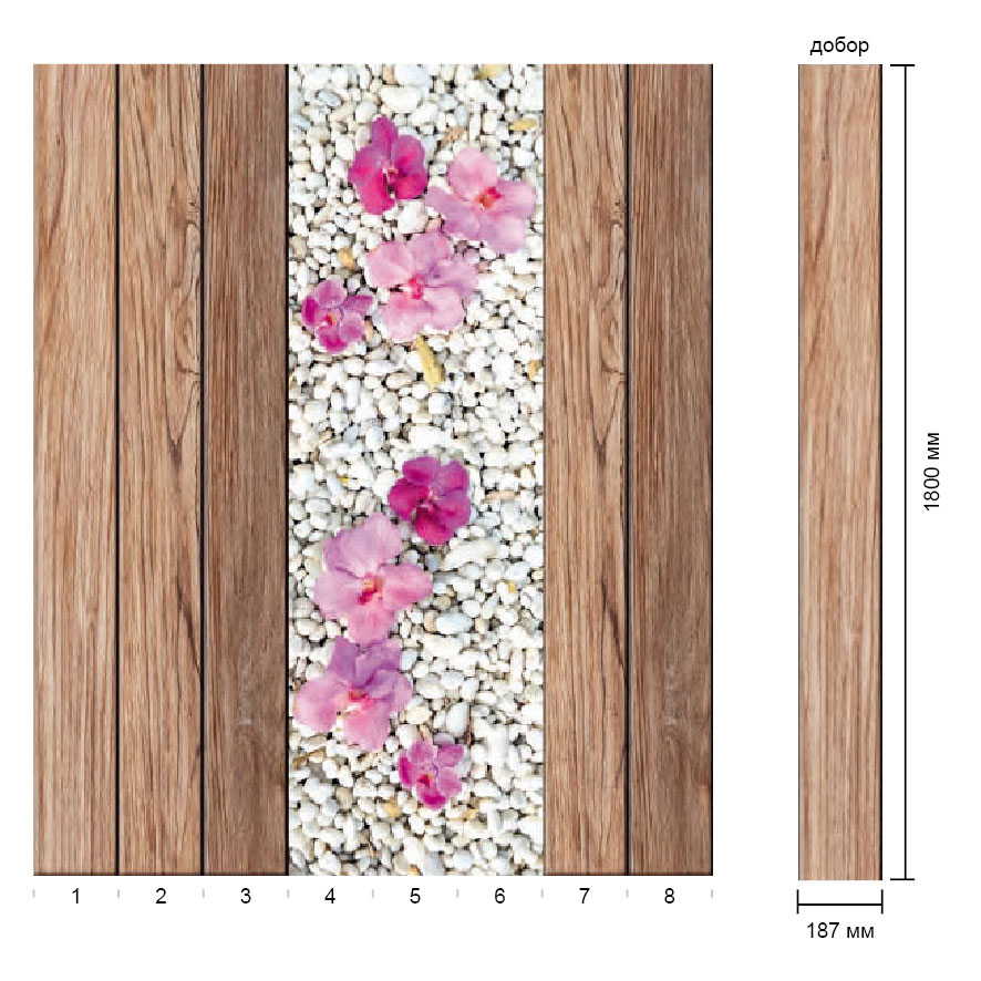 Влагостойкие 3D полы Орхидея имитируют поверхность дерева с полосой гальки, украшенной цветами. Напольная отделка "под дерево" с вкраплениями водных атрибутов - подходящий дизайн для пола ванной, санузла, площадки рядом с внутренним бассейном и других помещений с повышенной влажностью.