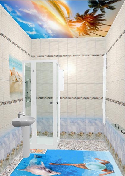 Влагостойкий 3D пол Ундина с летней пляжной композицией - яркое и эффектное украшение ванной, кухни, лоджии, дачи и других помещений, где повышена влажность. Покрытие с изображением девушки в купальнике, играющей с дельфином на галечном фоне, станет главным объектом внимания интерьера.