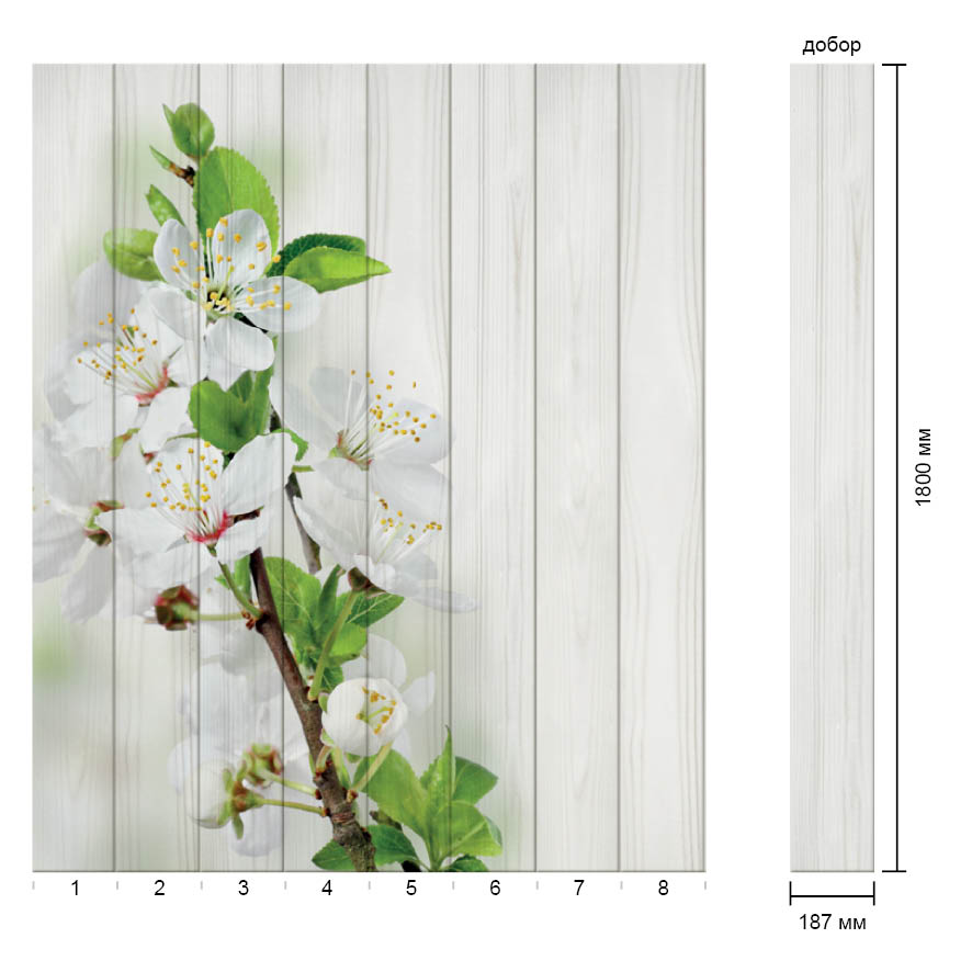 Коллекция Вишня состоит из 8 ламелей. Если комплект покрывает не всю площадь помещения, то можно купить отдельно доборы с аналогичным дизайном размером 1800*187 см. Занимаемая площадь: 2,7 м2.