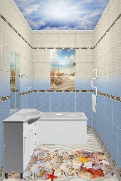 Влагостойкий 3D пол Волна с ракушками и морскими звездами - практичный вариант напольной отделки. Пастельная светло-бежевая гамма и глянцевая текстура 3д пола эффектно выглядит в интерьере туалета, ванной и других помещений с повышенной влажностью.