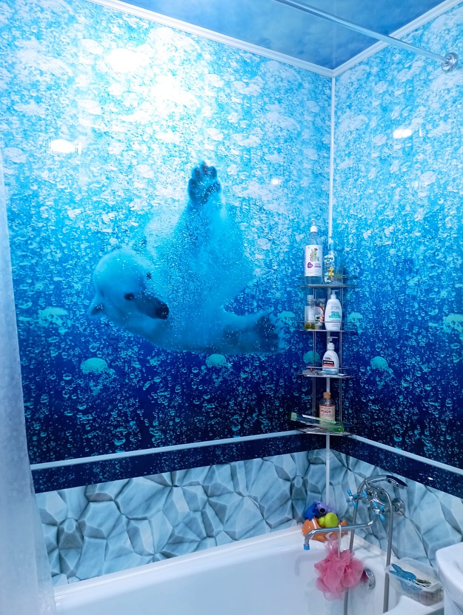 Оплата картой онлайн переводПанель ПВХ Панда Атлантика рисунок 2 состоит из четырех ламелей и продаётся комплектом. В центре - изображение белого медведя под глубинами северных вод, снизу панелей - имитация кусков льда.