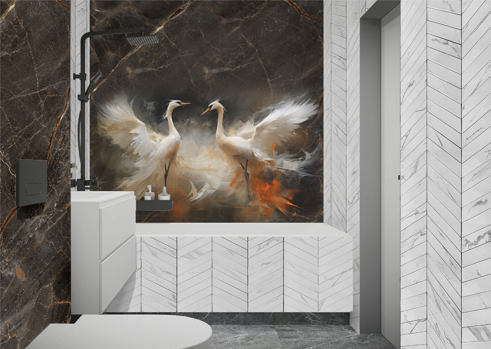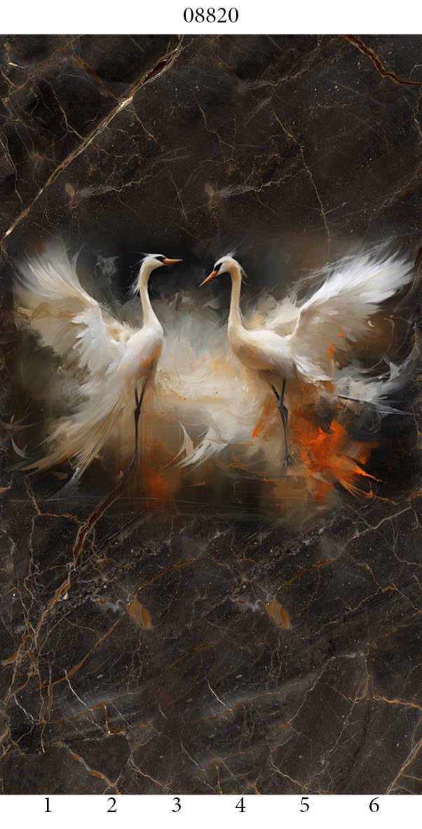 Панель ПВХ Панда Журавли (панно) из 6 - ти панелей в коричнево - белой гамме украшена изображением самых красивых птиц - белых журавлей. Рисунок продается комплектом. Вся серия имитирует мраморные слэбы в современных тонах.