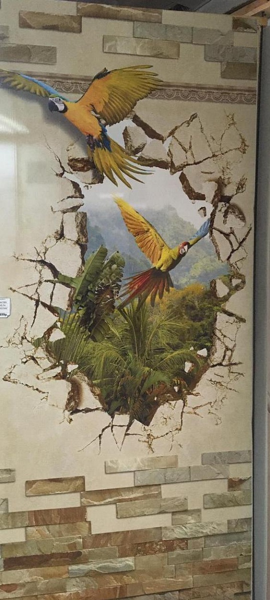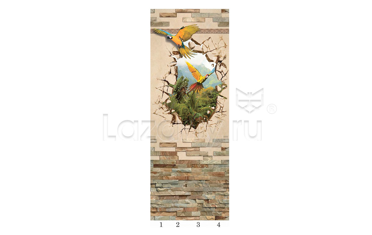 Оплата картой онлайн переводПанель ПВХ Панда Путешествие рисунок 2 состоит из четырех ламелей и продаётся комплектом. Низ и верх имитируют каменную кладку в бежевых тонах. В центре иллюзия попугаев в джунглях.