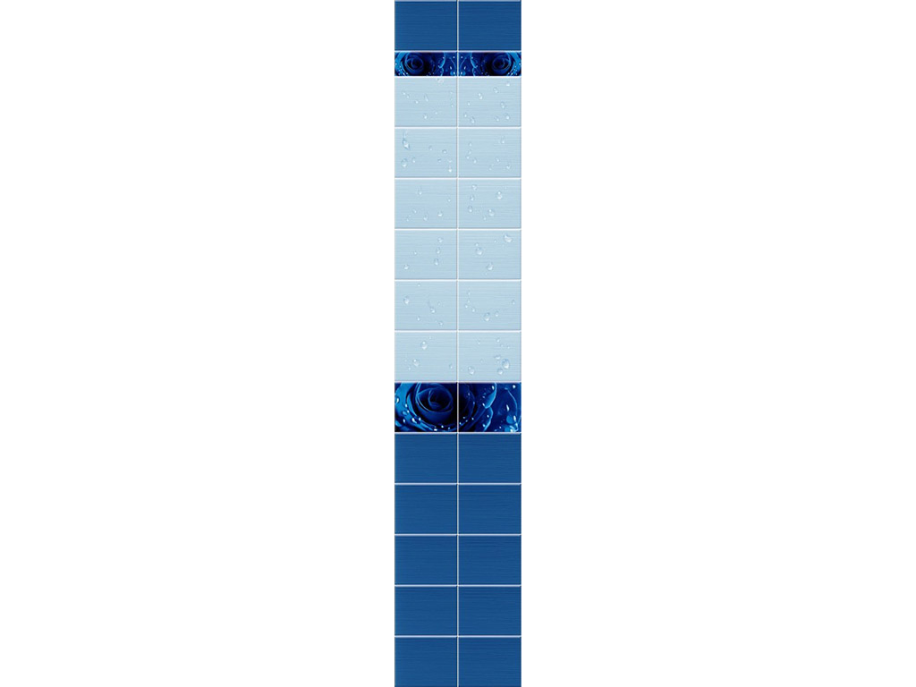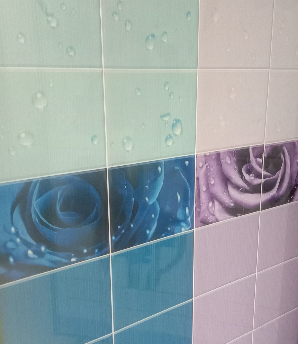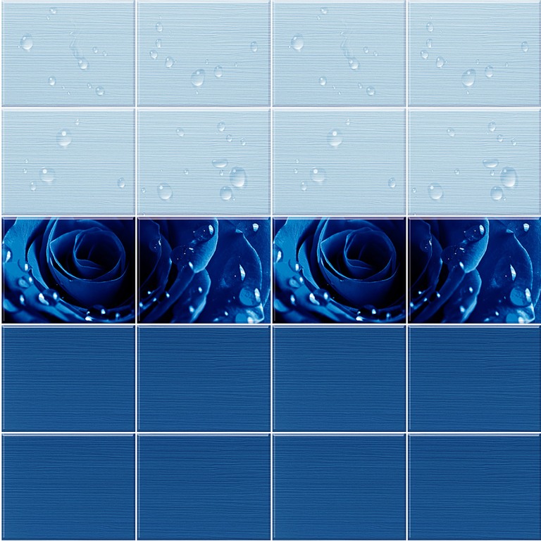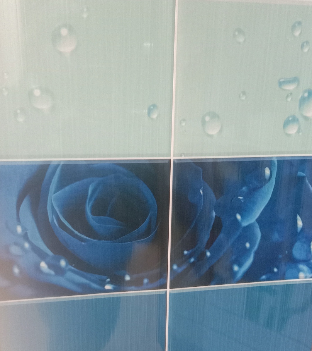 Панели ПВХ Капли росы синий продаются только комплектом, состоящим из двух панелей, составляющих целый узор. Поверхность покрыта высоко - глянцевым лаком, что придаёт панелям шик и создаёт глубину пространства. Изображение точное и качественное. Используются в помещениях с любой влажностью.