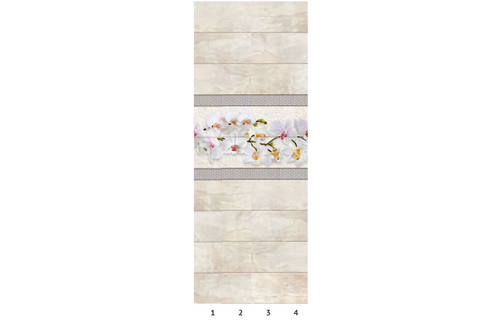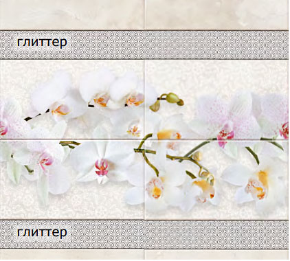 Оплата картой онлайн переводКоллекция панелей ПВХ Орхио выполнена в светлых пастельных оттенках. По центру панелей пущен нежный горизонтальный декор из белых орхидей. Бордюр из сверкающего серебристого глиттера украшает цветочный принт с двух сторон. Вся серия стилизована под керамическую плитку крупного формата, уложенную горизонтально.