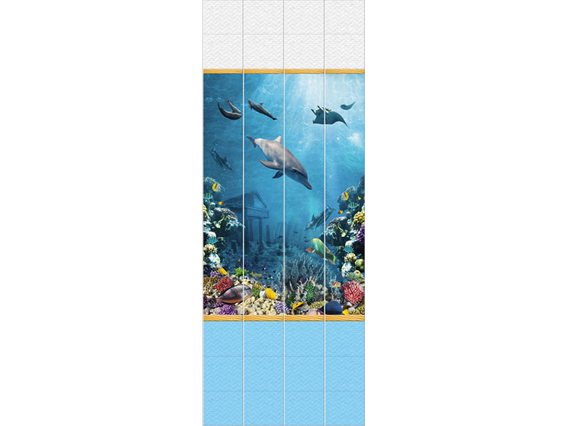 Панели Юник Подводный мир узор продаются только комплектом. Четыре панели составляют основной рисунок. Поверхность покрыта высоко - глянцевым лаком. Благодаря его зеркальным свойствам помещение зрительно увеличивается, а качество изображения радует взгляд. Продукция используется в помещениях с любой степенью влажности.