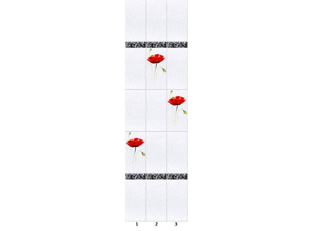 Оплата картой онлайн переводПанель ПВХ Novita Алые маки (узор), состоящий из красных маков на белом фоне, украшен темным декоративным бордюром с эффектом мерцания. Добор украшен флористическим узором снизу доверху. Основной рисунок состоит из трех ламелей и продается комплектом. Пластиковые стеновые панели подходят не только для отделки ванной, кухни, лоджии, но также для стен офисов, учреждений, нежилых помещений.