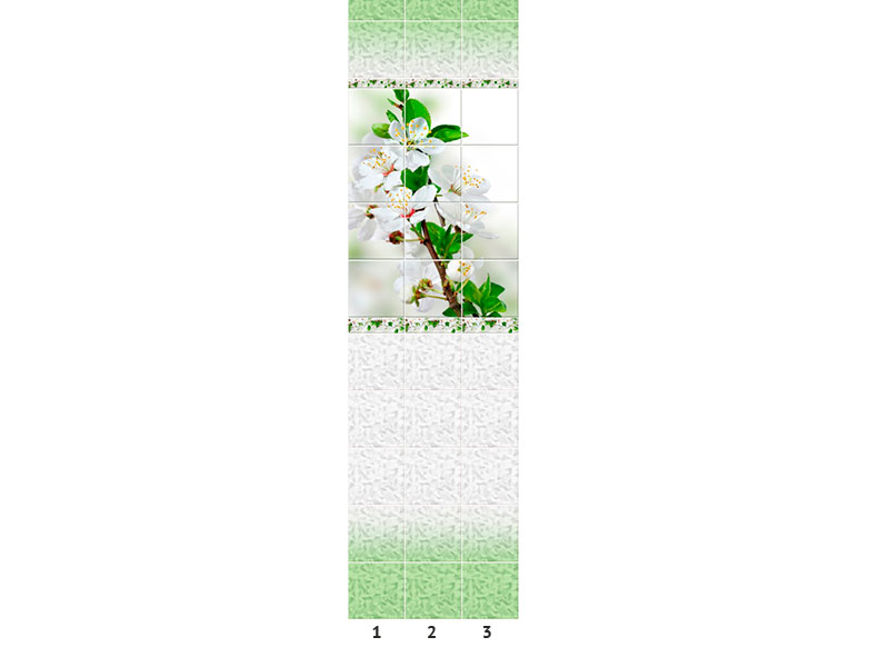 Оплата картой онлайн переводРисунок коллекции панелей ПВХ Novita Белая вишня состоит из трех ламелей и продается комплектом. В центре композиции веточка белой вишни с нежными цветами. Декоративный тонкий бордюр с растительным рисунком зеленого цвета пущен по верху и центру ламели. Растяжка фона от яблочного цвета к белому и наоборот выполнена по всей высоте ламели. Коллекция стилизована под квадратную керамическую плитку с характерными стыками.