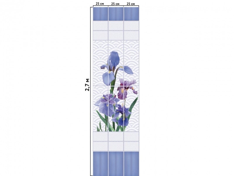 Для удобства монтажа панелей ПВХ, с целью помочь вам и мастерам сделать предварительное представление о размещении рисунка и возможности его обрезки с сохранением дизайна в конкретном помещении с учётом его проекта, высоты ванны, душевой кабины, потолка вашей комнаты, мы сделали расчёты размещения рисунка по вертикали.